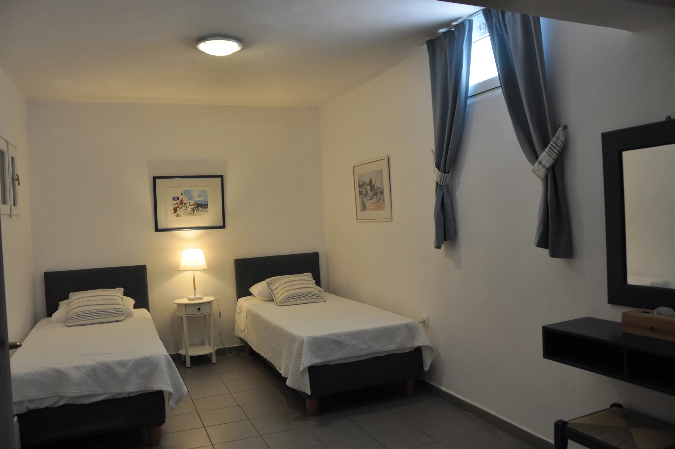 The first floor comprises of two separate bedrooms of which one with two single beds, which can be made up as a double bed, and the other with one double bed, TV in each bedroom, independent air-conditioning /heating, bathroom with shower, private balcony with either sea or pool and garden view.